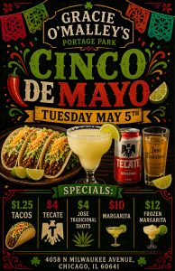 Cinco de Mayo lands on a Tuesday, which means Gracie O’Malley’s Portage Park is doubling down with a taco-and-tequila-fueled celebration all day long. If you’re looking for Cinco de Mayo specials in Chicago, this one has the essentials covered with tacos, Tecates, shots, margaritas, and frozen margaritas ready to keep the party going.